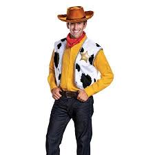 Brown leather look chaps and vest with black leather look area on vest and the same on chaps plus fringe. Waist 42 inches and chest 48 inches 50 inches. This costume kit has everything you need to kick up your cowboy boots and pay homage to the disney pixar classic toy story pair the included woody esque vest bandana and hat with your best pair of dad jeans and a yellow plaid button down for a fashionable ensemble with a little extra yee haw.