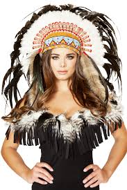Campsis indian peacock feather headbands boho princess head chain bule adjust headdress handmade rope hair accessories for women and girls g 4 5 out of 5 stars 340 8 66 8. Adult women s full indian costume headdress. Secondly it is important to wear clothes that resemble indian womens clothing such as a simple brown dress with fringe.